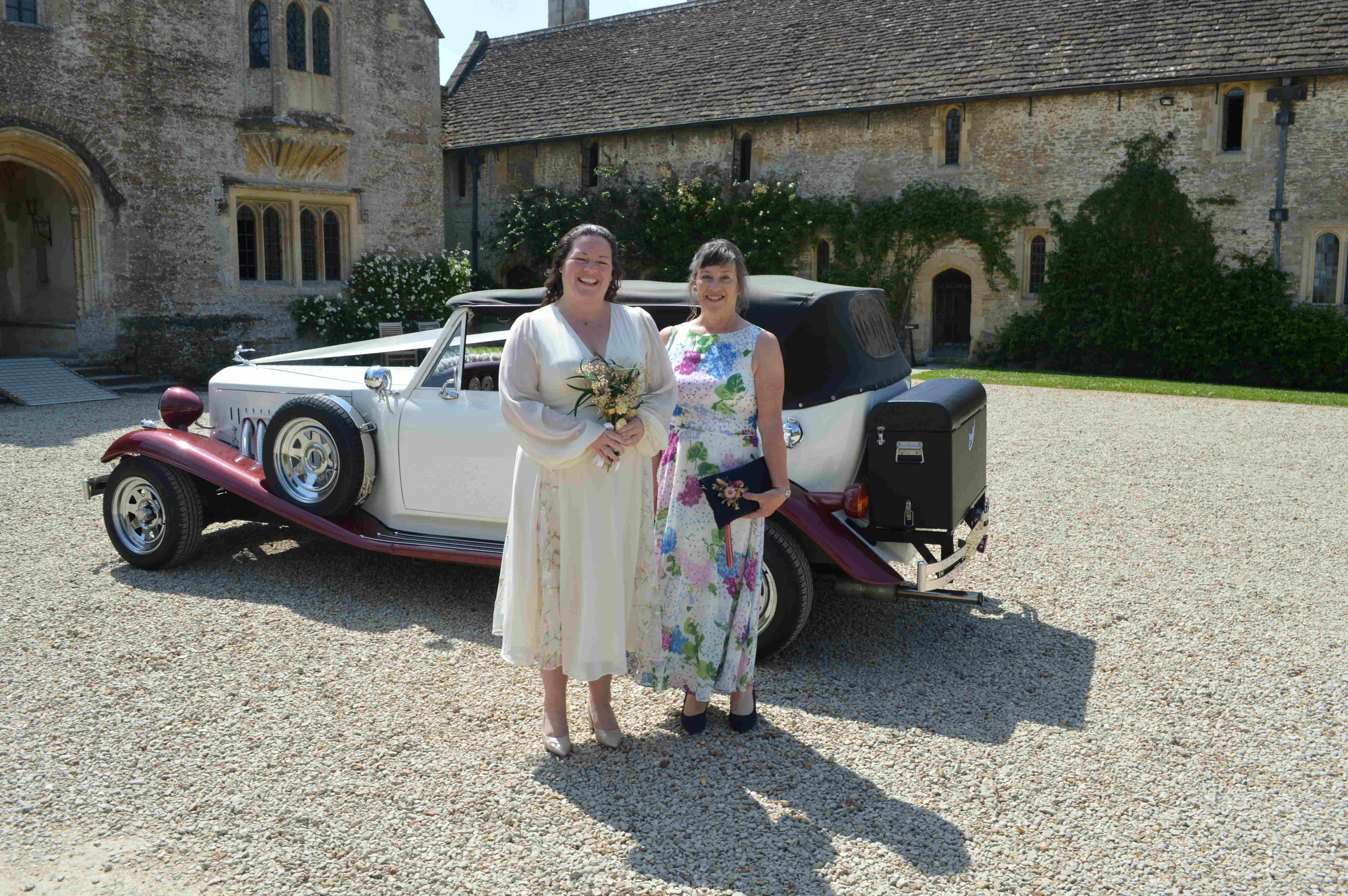 Laura travelled to Great Chalfield Manor with her Mother in the Beauford and they are pictured below. Laura and James are also pictured below coming out of the Church just after they were married